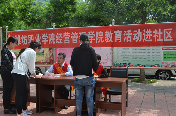5月10日,经营管理学院走进潍坊市高新区蓉花社区开展职业教育活动周教育教学成果展示活动。该院教师与学生代表共计20余人参加了活动。