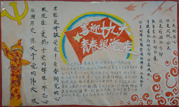 同学们积极准备,查找资料,学习党的知识,涌现出大量主题突出、内容丰富、设计精美、图文并茂的优秀作品。大家通过多样的版块,有的用朴实生动的文字讲述中华光辉历史,有的用斑斓的画笔描绘祖国未来的发展,有的对新学期的学习生活作出新的目标规划,从不同角度表达对十九大召开的热切期盼和真诚祝福。(王婷婷供稿)