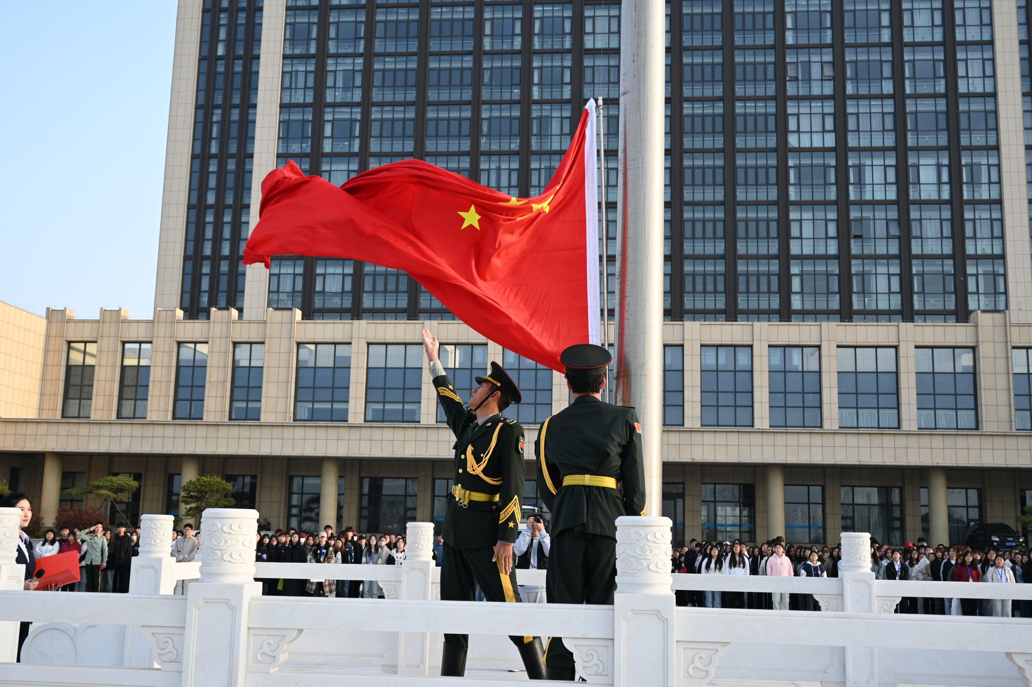 早晨7点,升旗仪式的正式开始。英姿飒爽的国旗护卫队迈着整齐有力的步伐护送国旗走向升旗台,鲜艳的五星红旗迎着朝阳缓缓升起,同学们庄严肃立,表达对祖国的无限热爱与崇高敬意。接着,辅导员老师代表和学生代表开展国旗下讲话,勉励同学们要铭记革命先烈的光辉事迹,将他们的精神内化于心、外化于行,用实际行动践行青春誓言,为祖国的繁荣富强贡献自己的力量。