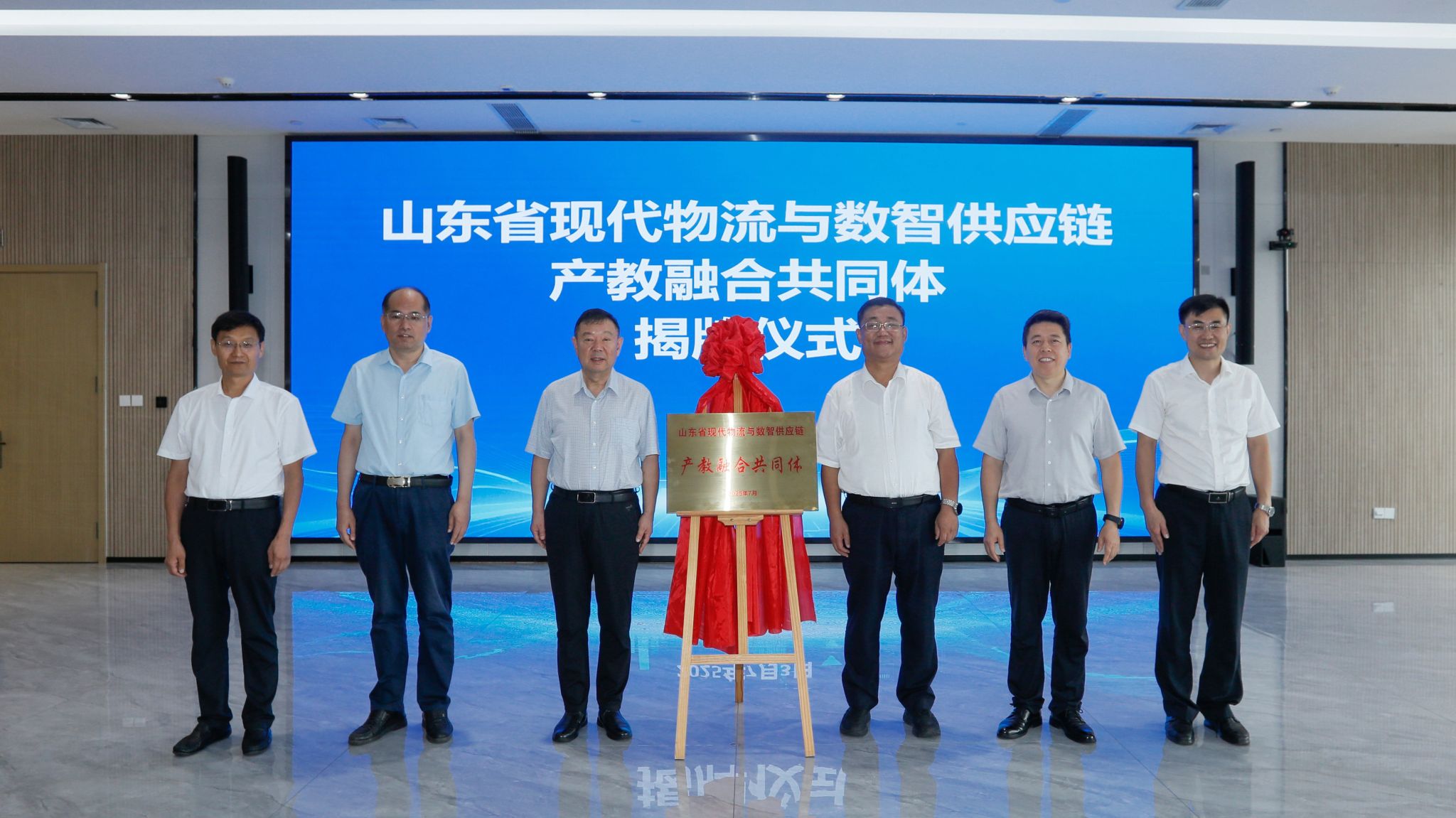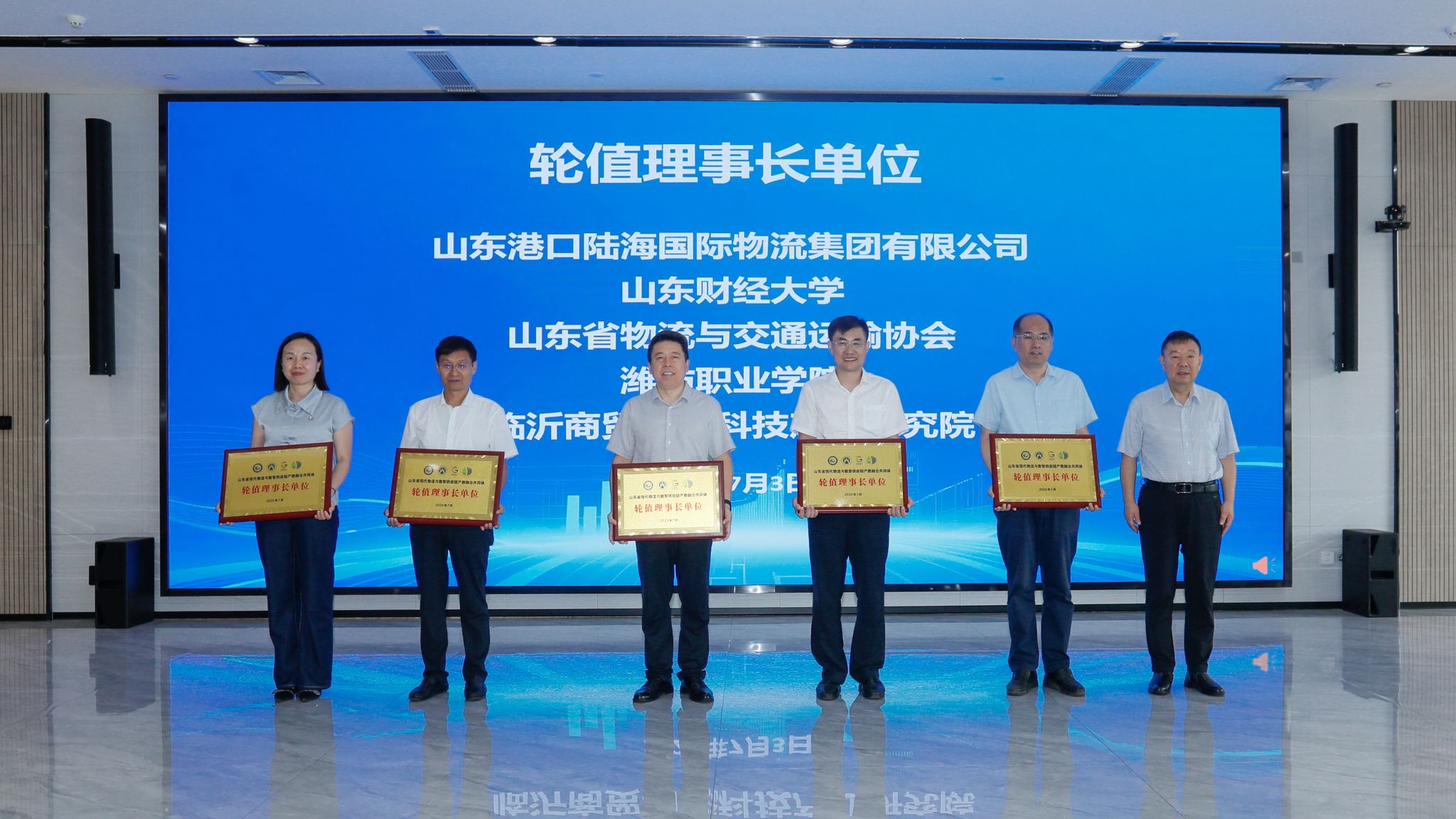 任豪祥、韩瑞东为山东省现代物流与数智供应链产教融合共同体揭牌。随后,对轮值理事长单位、副理事长单位进行了授牌。