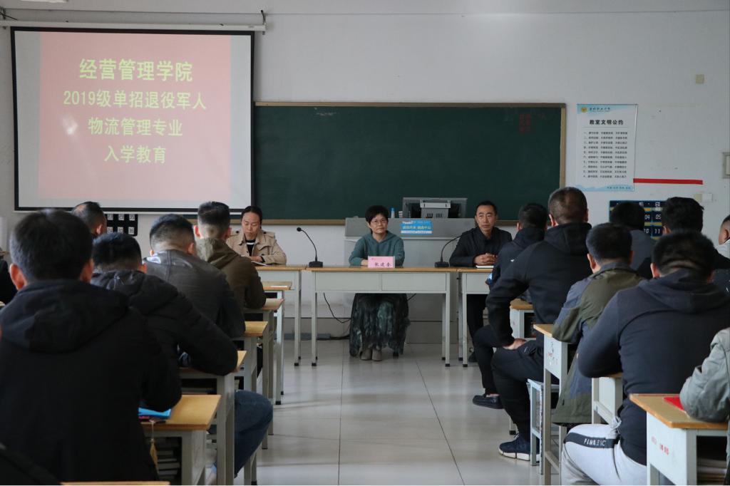 2019年10月15日上午,经营管理学院在惠泽一号楼114教室举行2019级单招退役军人物流管理专业新生入学教育。学院负责人、新生班主任及2019级全体单招退役军人物流管理专业新生参加了报告会。