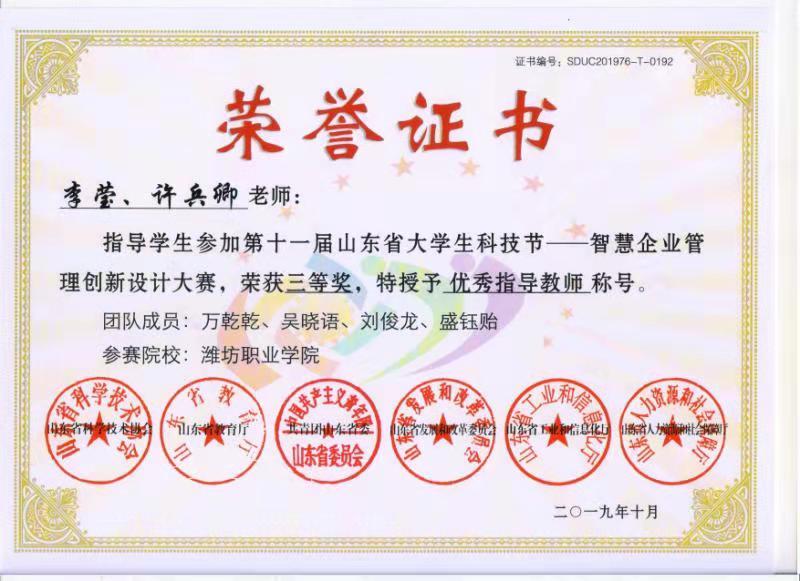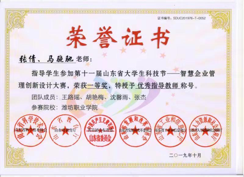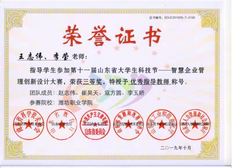 本届山东省大学生科技节上,经营管理学院积极组织训练、参赛,参加了山东省大学生智慧企业管理创新设计大赛三个子赛项的比赛,并取得了优异成绩:其中,“财务共享能力方案设计比赛”,由刘淑贤、张倩老师指导,获得一等奖;“智慧企业财税审经营模拟赛”,由张倩、马骁驰老师和郑福芹、李丽老师指导的两支代表队均获得一等奖;“新零售虚拟仿真精英赛”,由王志伟、李莹老师和李莹、许兵卿老师指导的两支代表队均获得三等奖。