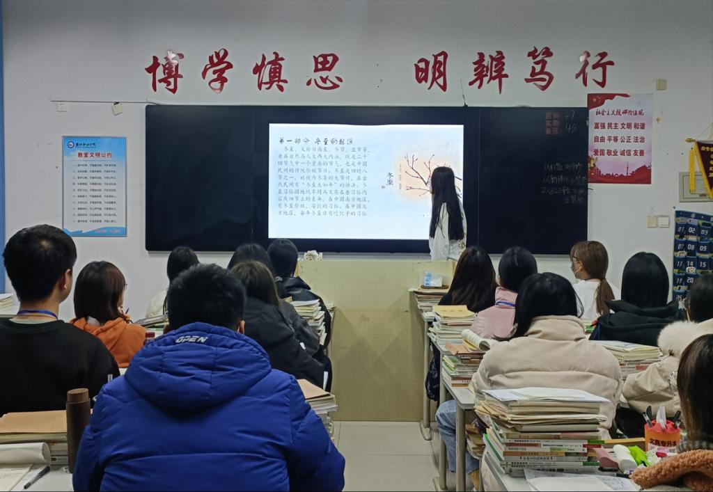 主题团课上,各班团支书通过视频、PPT及图片文字等多种形式,向同学们讲述了冬至的渊源、风俗习惯及中华传统文化等内容,使学生们了解了冬至的气候特征、气候知识、节日的由来,学习了相关的谚语与诗词,对冬至这个传统节日有了更加深刻的认识。最后,团支书组织同学们一起学习朗诵冬至节气的诗歌,交流分享他们对冬至节气的理解和体验,感受节气氛围。