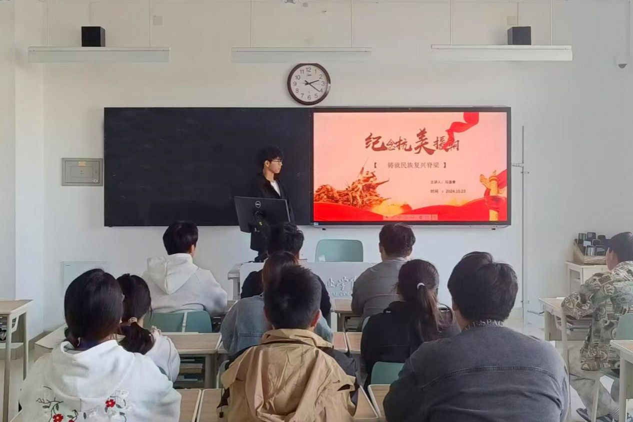 本次团课紧密围绕“抗美援朝战争的性质及重大意义”“抗美援朝的战争经过及精神内涵”“抗美援朝历史的时代价值及启示”三大核心议题展开,各班团支书通过珍贵的历史照片、动情的片段,让同学们深入了解抗美援朝战争史实,感悟抗美援朝重大战略意义,清醒认识当今国内外形势,坚定民族复兴信心。团课播放了电影《志愿军:雄兵出击》的精彩片段,借助银幕上的英雄形象,生动展现了志愿军将士的英勇事迹,进一步加深了同学们对抗美援朝精神的理解与共鸣。随后的交流互动环节,同学们踊跃发言,纷纷表达了自己的学习心得,一致认为抗美援朝精神是中华民族宝贵的精神遗产,应当将个人成长融入国家发展大局,以实际行动为祖国的繁荣昌盛贡献力量。