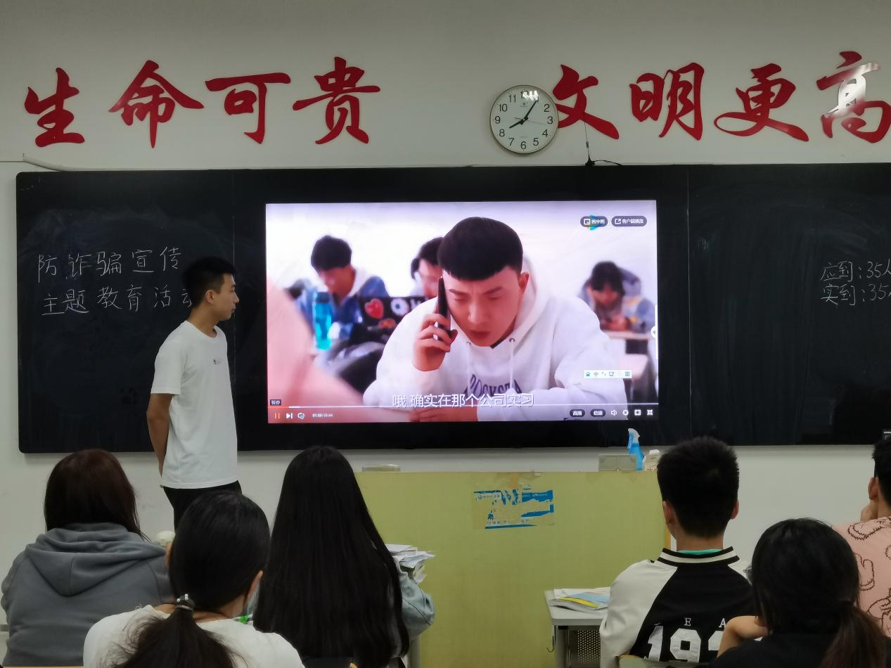 主题教育活动中,各班级负责人组织开展了预防诈骗主题班会,通过深入剖析真实案例的方式,为同学们讲解了电信诈骗、网络诈骗、注销校园贷诈骗、游戏诈骗、求职诈骗等常见的校园诈骗,理论联系实际,使学生了解到目前诈骗手段的多样性和迷惑性,告诫同学们要时刻保持清醒的头脑,加强防骗意识,谨防骗局。组织观看了《暗流涌动》纪录片,该片主要围绕“冒充公检法”、“网络刷单”、“杀猪盘”等五个真实案例改编,通过五个故事讲述当下学生广泛受骗的过程和经过,剖析学生受骗上当的心理过程。最后,个别同学还分享了自己周围曾经发生过的诈骗故事,提醒同学们务必提高警惕,保护好自己的财产安全。
