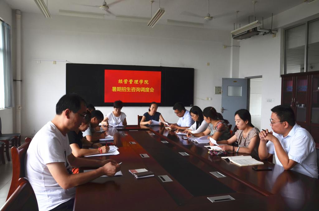 7月12日上午,经营管理学院在惠泽一号楼A区305室召开暑期招生咨询调度会。经营管理学院主要负责同志、分管招生就业负责同志、各招生小组随队教师及暑期负责电话招生咨询教师参加了会议。