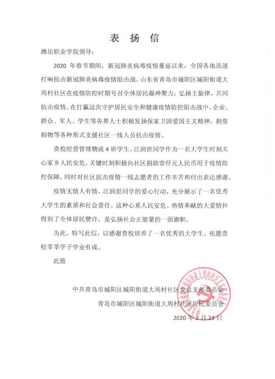 3月11日我院收到来自中共青岛市城阳区城阳街道大周村社区一封特殊的表扬信,2019级物流管理四班江润世同学向社区疫情防控无偿捐款壹千元人民币。他捐款的数目虽不巨大,却承载了爱的力量。在同学们眼中,他是善于助人的好朋友,当同学们有困难的时候,他总会会尽自己所能的帮助。