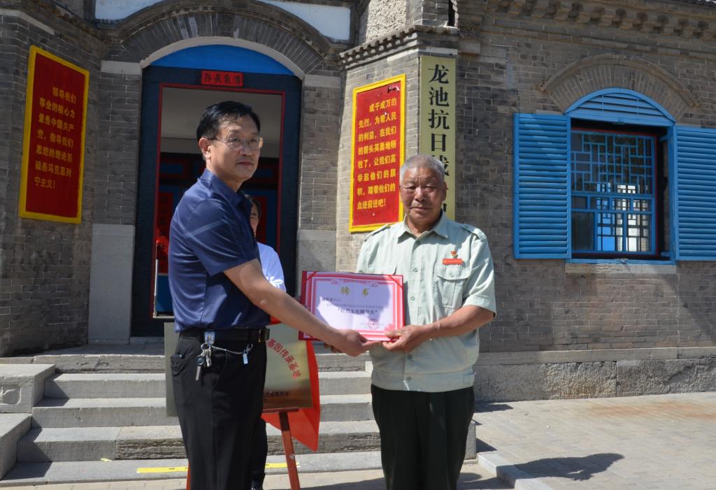 在昌邑龙池抗日战争纪念馆,举行了潍坊职业学院经营管理学院红色基因传承基地揭牌仪式。经营管理学院分管学生负责人为纪念馆老党员魏铁良同志颁发“潍坊职业学院经营管理学院校外红色文化辅导员”聘书。经营管理学院党总支书记致辞,他表示,我院与昌邑龙池抗日战争纪念馆共建红色基因传承基地,是深入学习贯彻党的十九大精神和习近平同志系列重要讲话精神的具体举措,学院将依托教育基地,利用好红色资源,深入开展党员和大学生的爱国主义教育、革命传统教育和革命英雄教育。